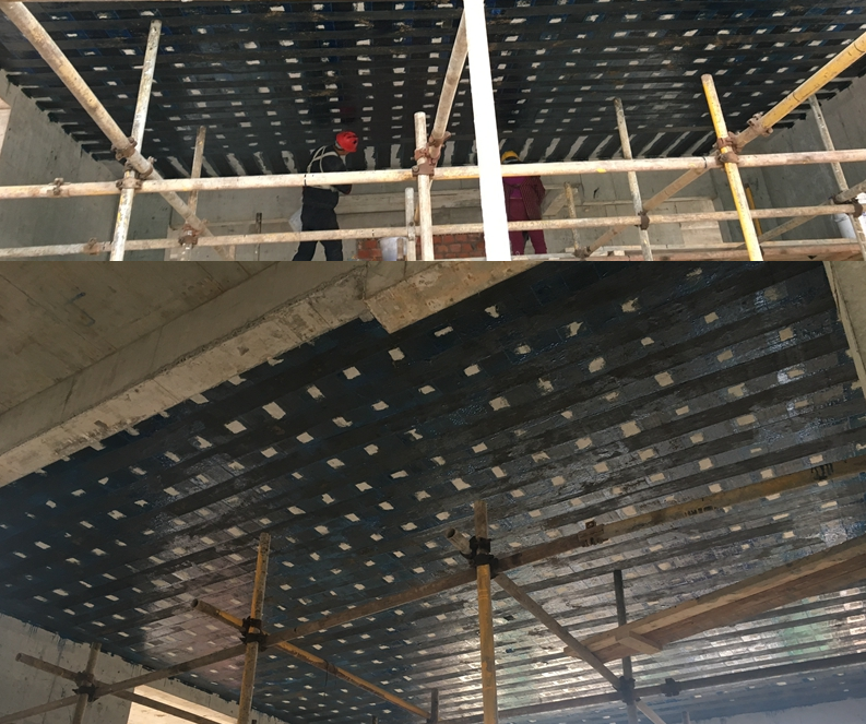 首创城南郡位于眉山市彭山县。该项目由于局部楼板承载力不足,需要对板底进行粘贴碳纤维布加固、板面用CGM灌浆料做叠合层。